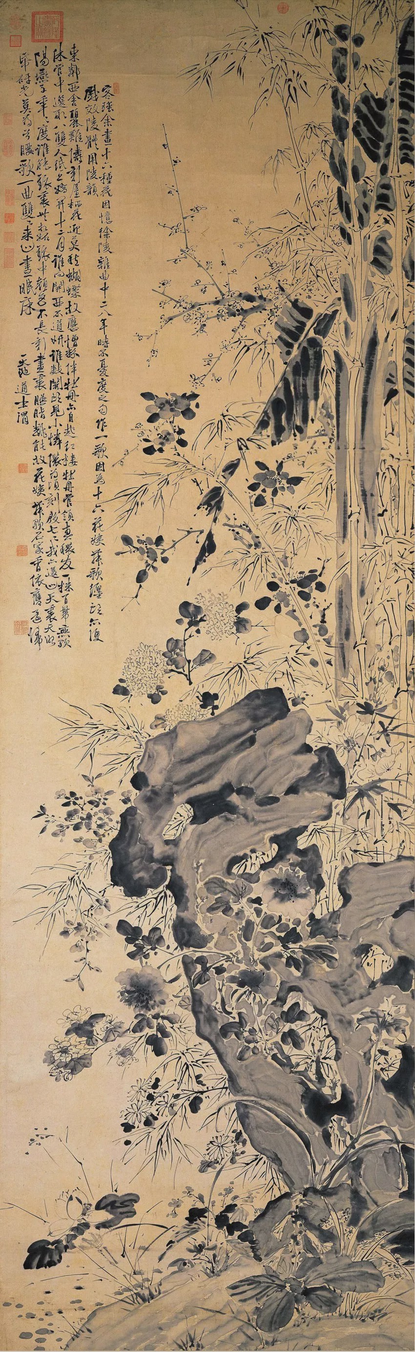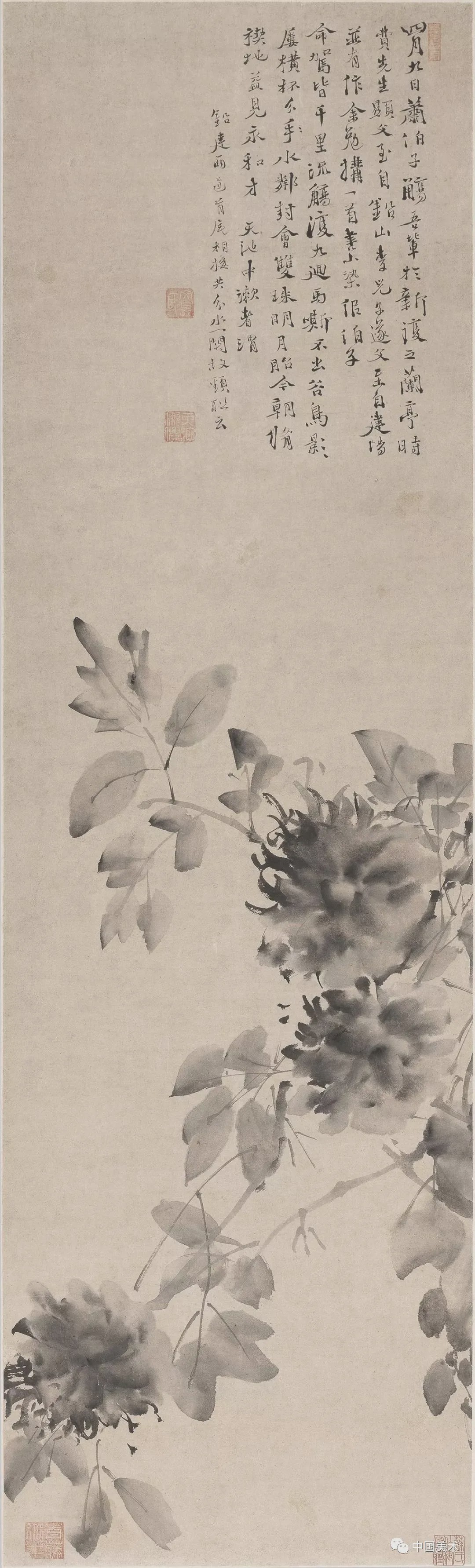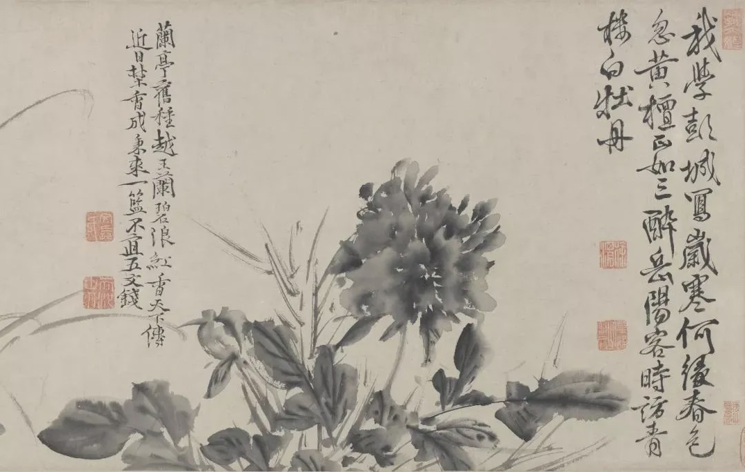 他画竹、牡丹实在画人,实在抒发心中块垒。有题墨牡丹云:“牡丹为富贵花,主光彩夺目,故昔人多以钩染烘托见长,今以泼墨为之,虽有生意,终不是此花真面目,盖余本窭人,生与梅竹宜,至荣华富丽风,若马牛宜弗相似也。”可见,他的泼墨牡丹不光是形式风格上的一种创造,而是有着深刻的思想意义的艺术创新。