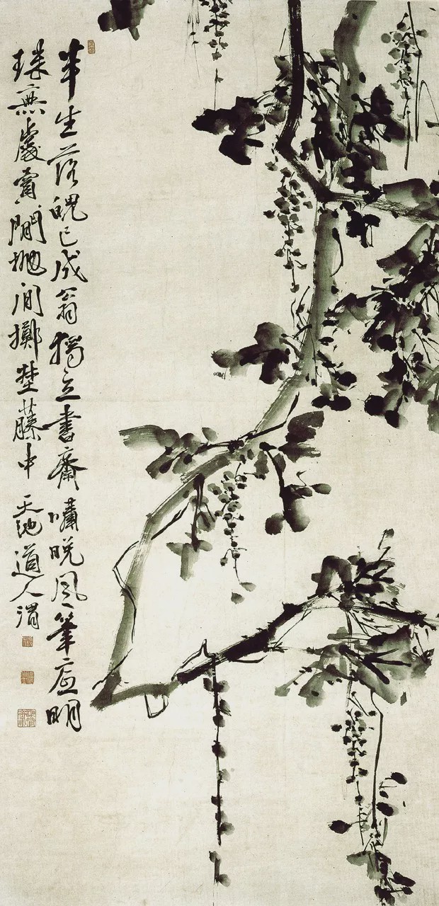 如他的《蕉石牡丹图》,画面布局就显得刻板、毫无生气,但题上款后,书画便相得益彰,结构严谨。此外,从《墨葡萄图》可以得知,他将一种饱经患难,壮志难酬的愤懑,尽情抒发宣泄于笔墨之中。在徐渭笔下,绘画不是客观对象的描摹再现,而是表达主观情怀的手段。绘画和书法在《墨葡萄图》中得到了充分自如的结合,其画面上所呈现的那种恣意的美,更具有一种生机蓬勃之感。