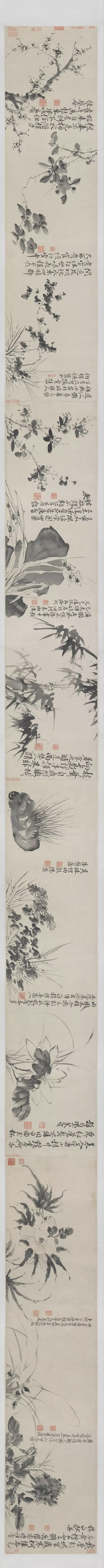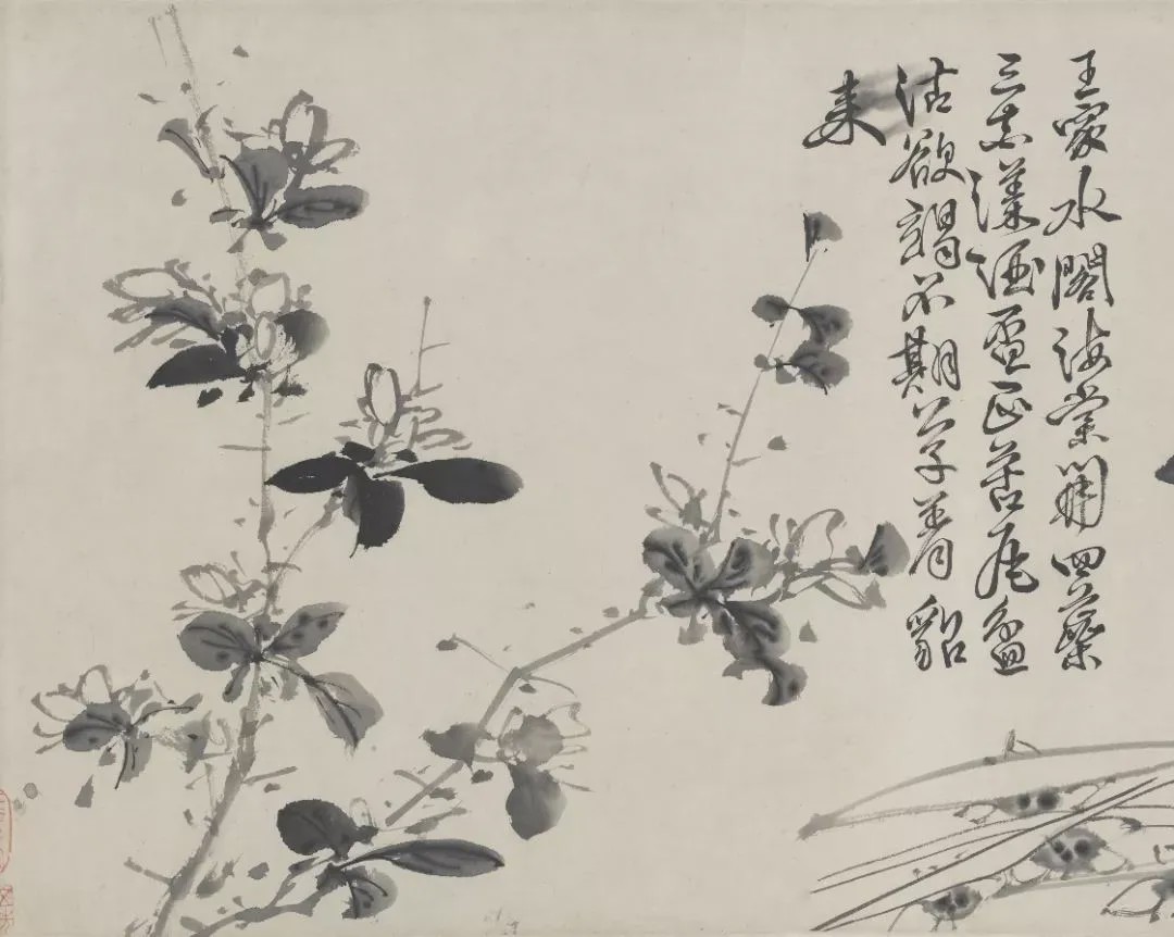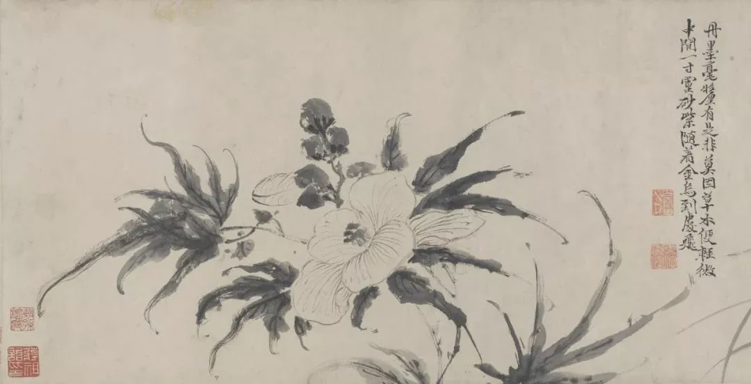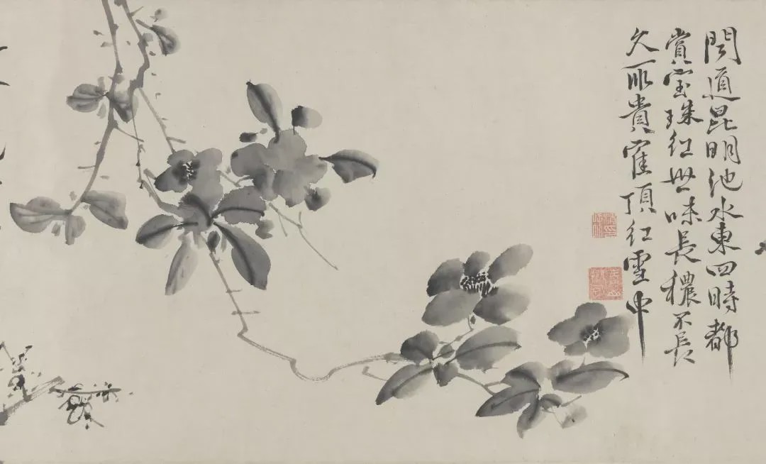 在这幅《十二墨花诗画图卷》中,徐渭充分发挥了水墨的表现力,以狂放的笔触,淋漓的水墨,变化多端的笔锋,泼墨、焦墨、破墨、双勾并用,寥寥数笔即勾画出了各种花卉的特征,简约却颇具神采。