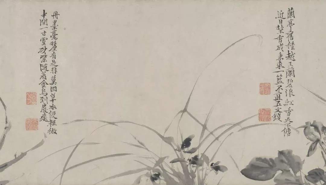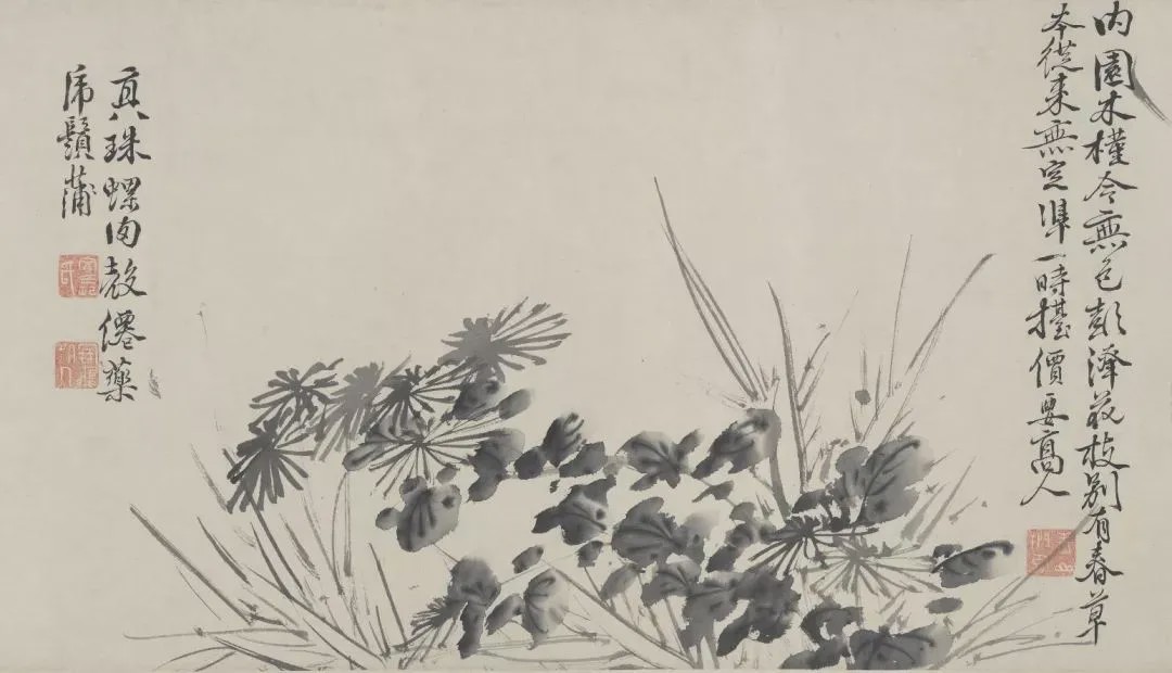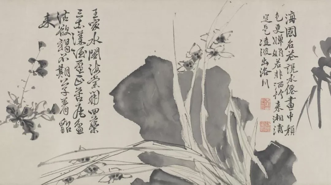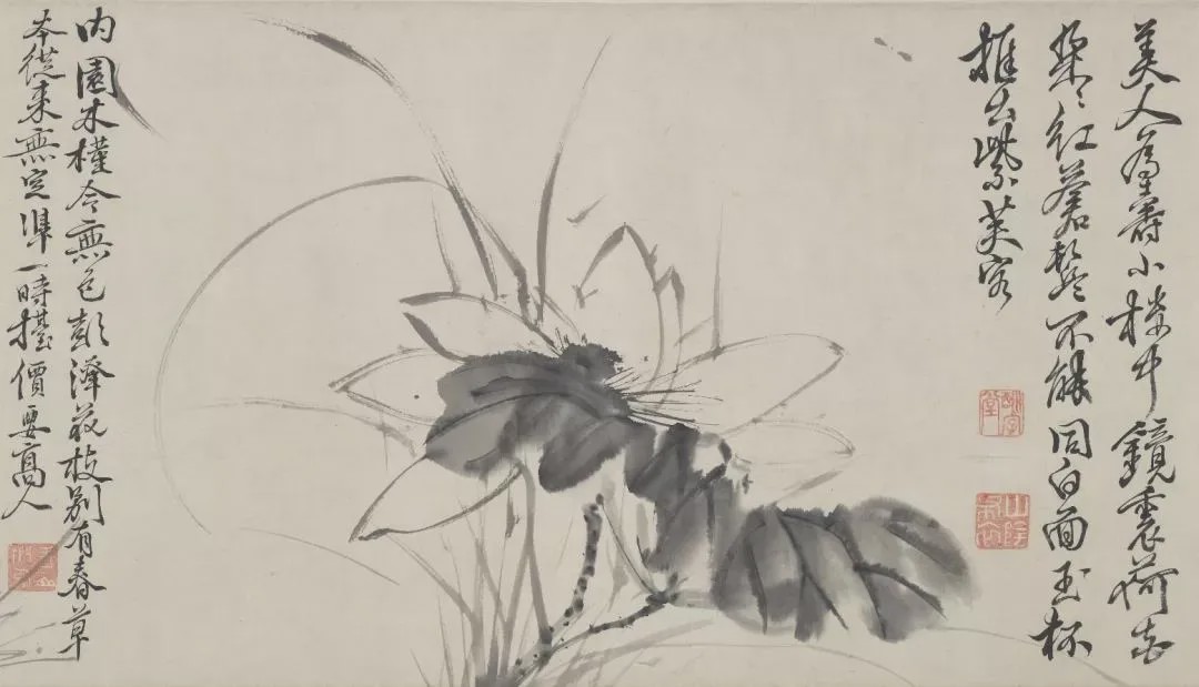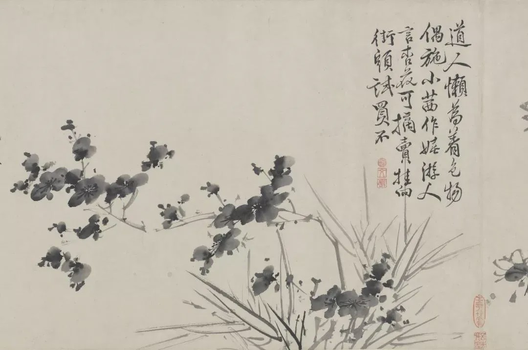 在这幅《十二墨花诗画图卷》中,徐渭充分发挥了水墨的表现力,以狂放的笔触,淋漓的水墨,变化多端的笔锋,泼墨、焦墨、破墨、双勾并用,寥寥数笔即勾画出了各种花卉的特征,简约却颇具神采。