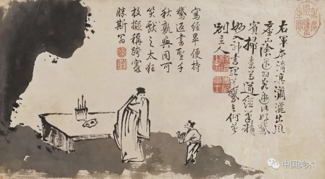 他画鱼、画竹、画蟹等,都处于一种近乎癫狂的状态,在用笔上,经常是酣畅淋漓的“涂抹”。他曾在题画诗中写道:“我昔画尺鳞,人问此何鱼?我亦不能答,张癫狂草书。”他说自己画鱼,画的只是笔情墨韵。他使文人画的理论和实践,从重“形神兼备”的主客观兼顾转向“意在象外”的重主观而次客观的大写意画发展阶段。他提倡的绘画艺术重在表现自我,表现画家的心灵,这也是文人画发展到高级阶段的标志。