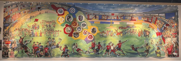 其二,是江苏城市精神与文体精神的集中彰显。画作中 13 支球队的队标与江苏省地图呼应,展现了江苏 “十三市联动” 的文体格局;泰州 11 号的倒挂金钩、镇江 47 号的英勇挡球,刻画的是 “拼搏不服输” 的文体精神;米卢观赛、球迷助威的场景,则传递出江苏对足球运动的热爱与包容。这些元素共同勾勒出江苏 “崇文尚武” 的城市气质,让画作成为展现江苏地域文化的 “视觉名片”。